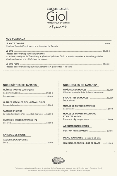 La Cabane Giol vous propose d’apprécier nos coquillages, tout juste sortis de l’eau, sur leur lieu de production. Installés en terrasse, sur la mer, ou dans notre salle intérieure au coeur de notre production, à quelques pas des parcs où grandissent les huîtres, La Cabane est ouverte en saison, en soirée, pour une dégustation conviviale autour de fruits de mer de qualité.